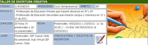 Como ya comenté en entradas anteriores, estaba inmerso en un taller de escritura creativa que ahora se acaba de confirmar. Aún estoy a la espera de que la inscripción sea suficiente para poder impartirlo, pero espero que no haya problemas para alcanza el cupo mínimo.
